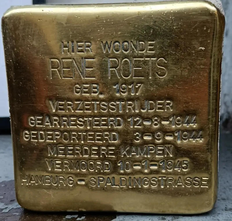 Op een gedenksteen in de Nederlandsche Gist- en Spiritusfabriek in Brugge wordt hulde gebracht aan vier medewerkers van de fabriek die de oorlog niet overleefden, waaronder René Roets.